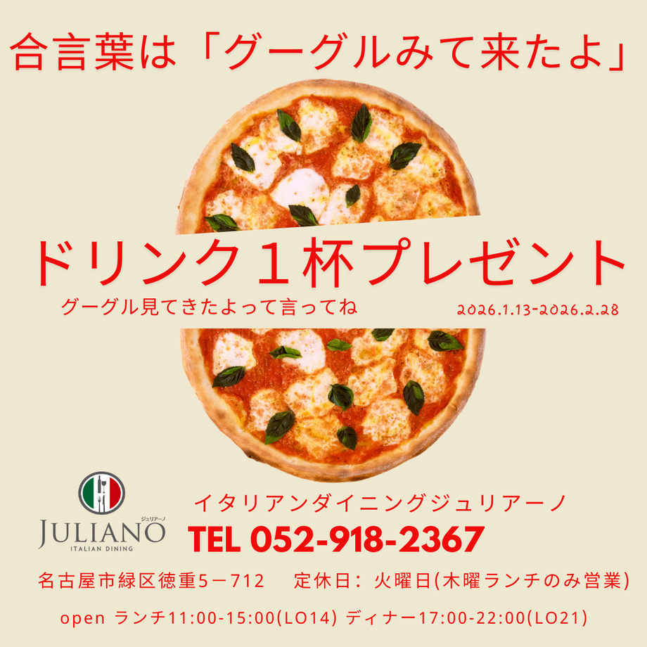 名古屋市緑区イタリアンジュリアーノでドリンク1杯プレゼント中! ご使用条件 有効期限2026年2月28日まで何回でもお使い頂けます ランチまたはディナーをご予約の1名さま780円までのドリンクに有効 *ご予約時にお伝え下さい